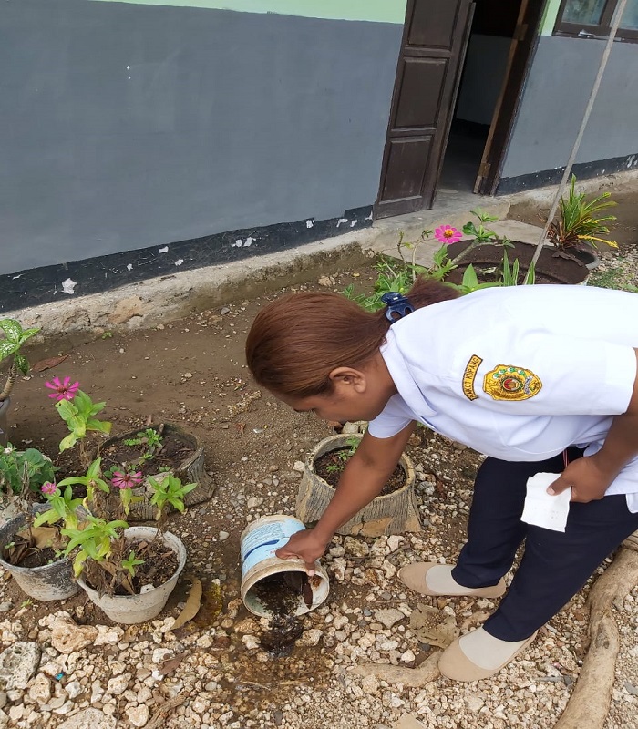 Petugas kesehatan Promkes dan pengelola upaya penyakit DBD Puskesmas Oesapa melakukan sosialisasi kepada siswa_siswi dan guru di sekolah dan juga melakukan pemantauan jentik langsung di halaman sekolah seperti pot – pot bunga, kaleng kosong, kamar mandi/WC dan te tempat – tempat penampungan air