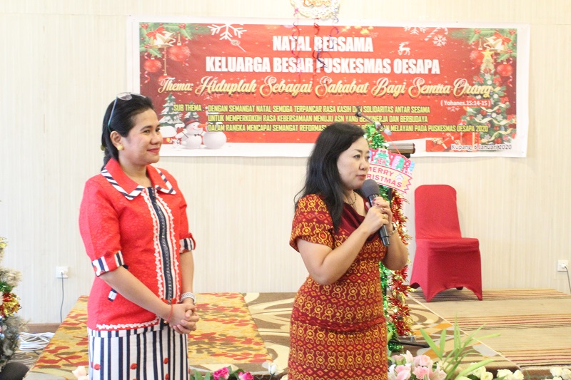 Sementara dalam acara Natal bersama ini juga Kepala Puskesmas Oesapa, dr. Trio Hardhina memperkenalkan drg. Shinta R. D. Ndaumanu, M.Kes sebagai kepala puskesmas baru yang akan menggantikan beliau sebagai Kepala Puskesmas Oesapa dan beliau akan menggantikan drg. Shinta R. D. Ndaumanu, M.Kes sebagai Kepala Puskesmas Kupang Kota.